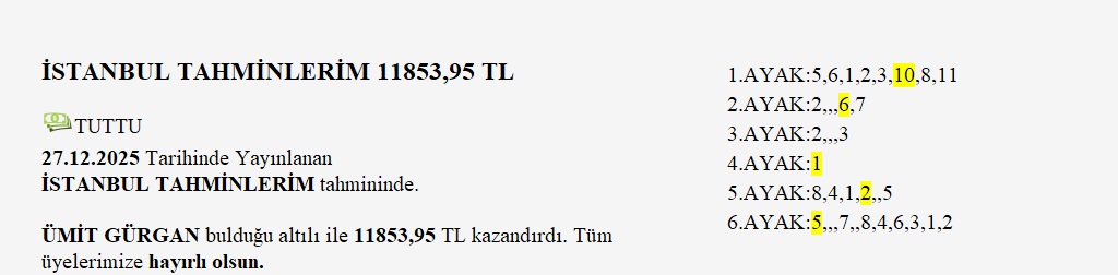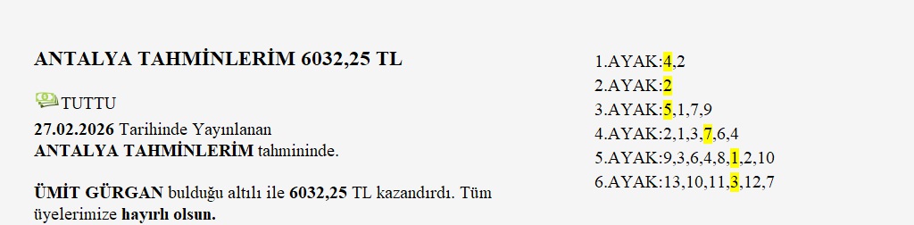 1.AYAK:4,2,5,8,62.AYAK:103.AYAK:3,1,4,54.AYAK:6,55.AYAK:6,5,7,4,1,3,116.AYAK:1,10,4,9,36'lı Ganyanda dağıtılacak tutar 6.175.910 t dir.
