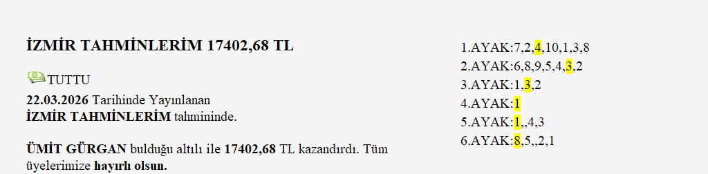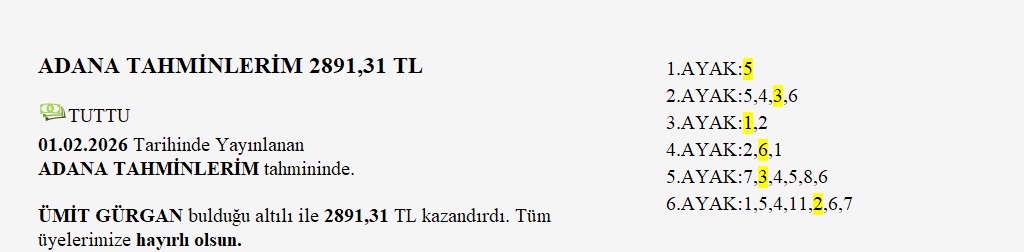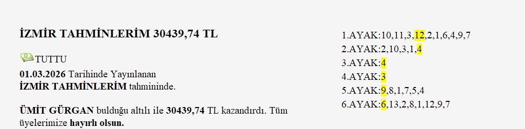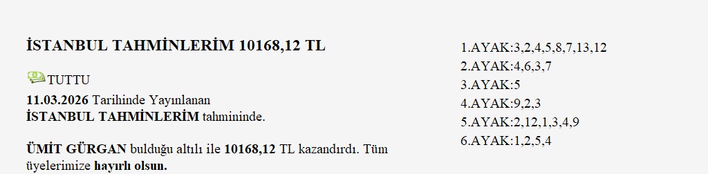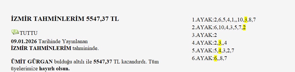 Bulan üyelerimiz güle güle harcasınlar. Bulamayanlar ise derst etmesinler, zira bence daha iyi ikramiyeler bile gelecektir.Haftaya moralli başlıyoruz. Birde Bursa altılısını doğru tahmin edersek harika olur.Herkese iyi şanslar ve güzel bir hafta diliyerek Bursa tahminlerime geçiyorum.ALTILI ŞABLONUM:1.AYAK:3,4,1,22.AYAK:2,1,9,5,83.AYAK:7,4,3,5,14.AYAK:2,3,65.AYAK:4,5,1,6,7,3,26.AYAK:66'lı ganyanda dağıtılacak tutar 13.316.335 t dir.